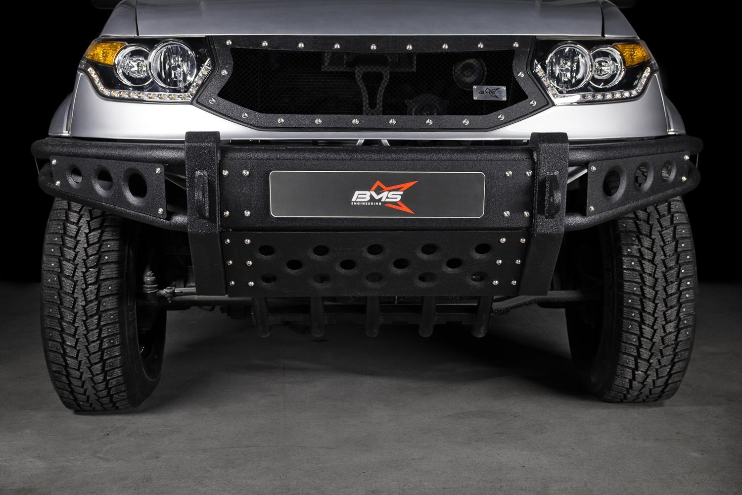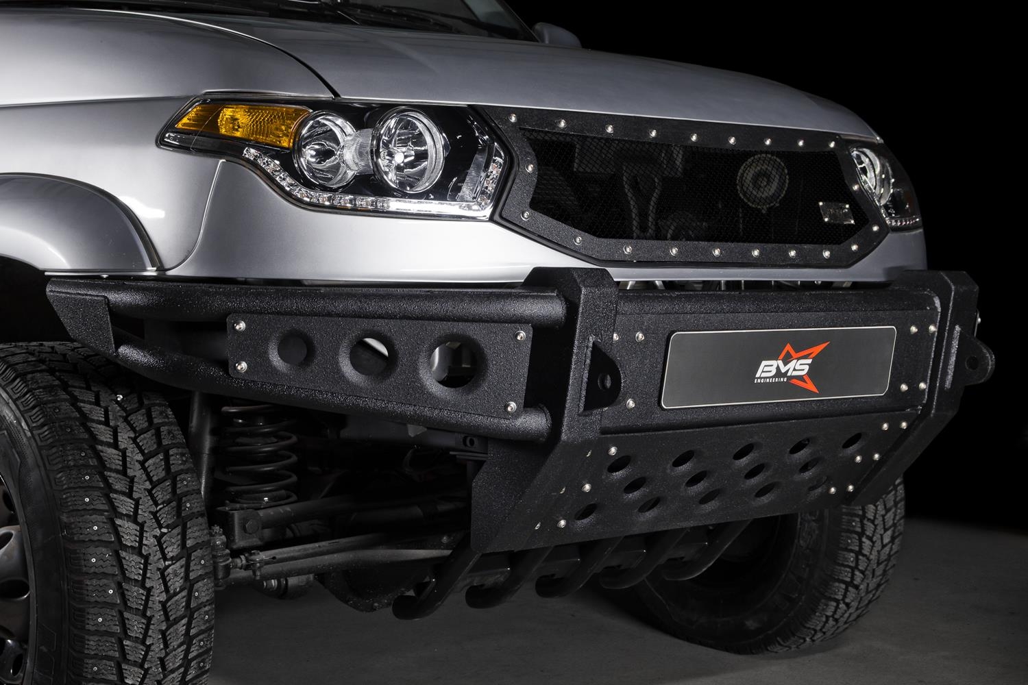 Хорошая замена штатному пластиковому бамперу УАЗ Патриот: силовой бампер BMS BAIKAL крепится к раме, повышает защиту авто от неожиданных препятствий и облегчает его буксировку. В этом бампере не предусмотрена площадка под лебёдку, но есть защищённые посадочные места для дополнительных источников света.