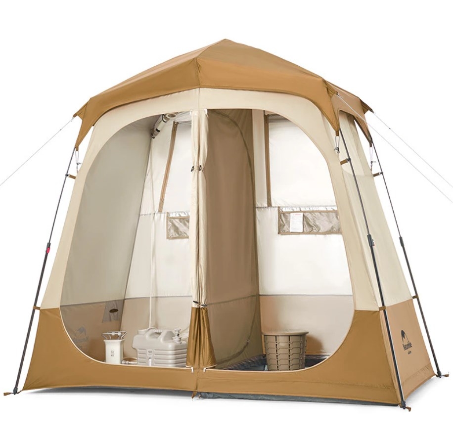 Этот вариант палатки еще удобнее - за счет двойной кабинки можно организовать их раздельное пользование, либо организовать душевую с отдельной раздевалкой.
